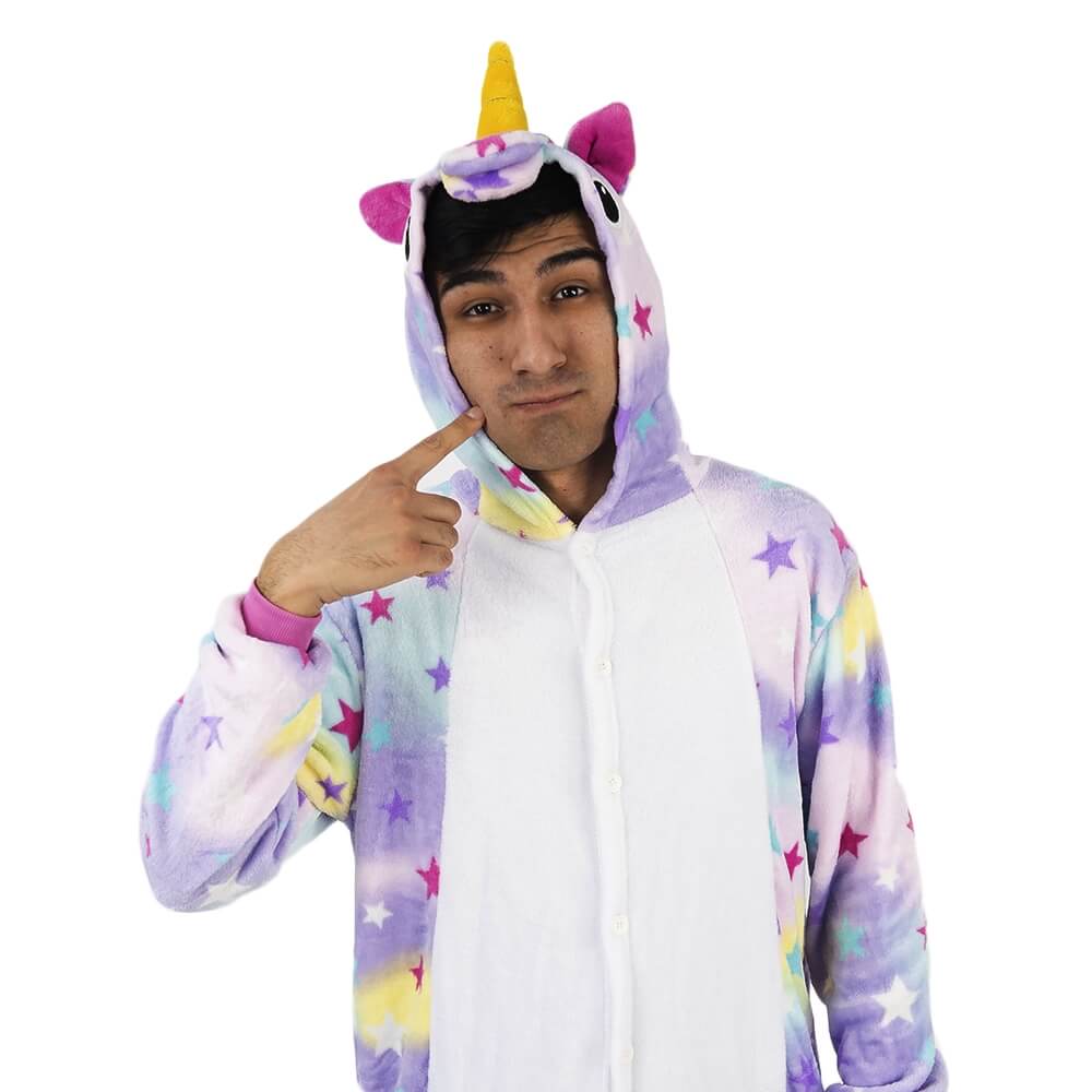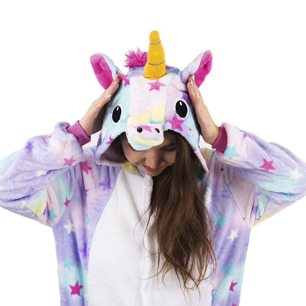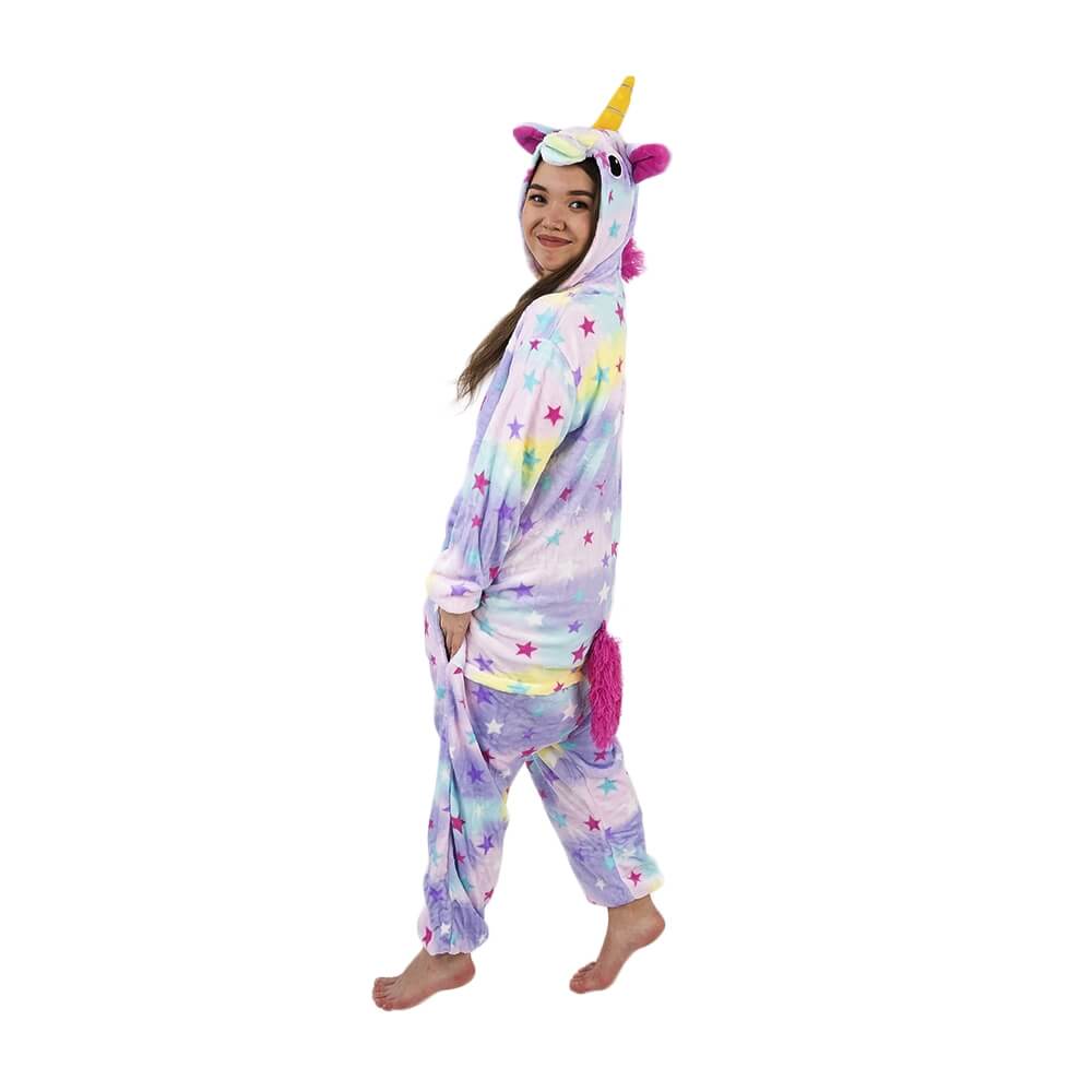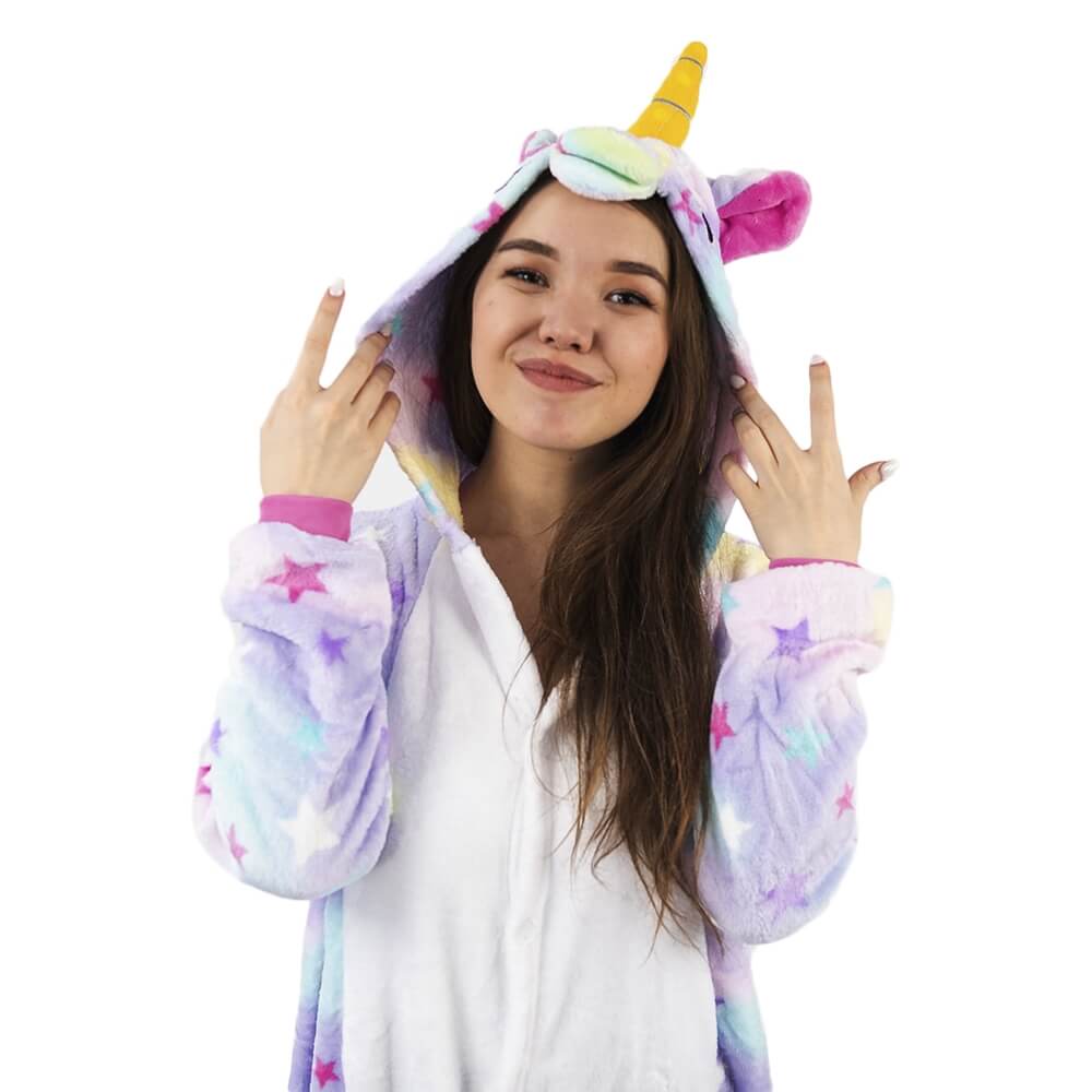 Красочный кигуруми Единорог создаст праздничное настроение. У него фантастический дизайн: большой мягкий рог на капюшоне, розовая грива и объемные ушки, сзади – хвост под цвет гривы. Основная ткань – разноцветная, усыпанная звездами, а на животике – белая вставка.