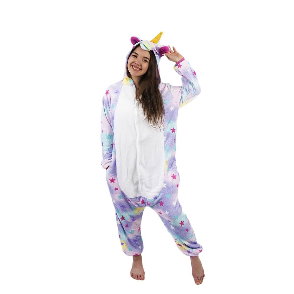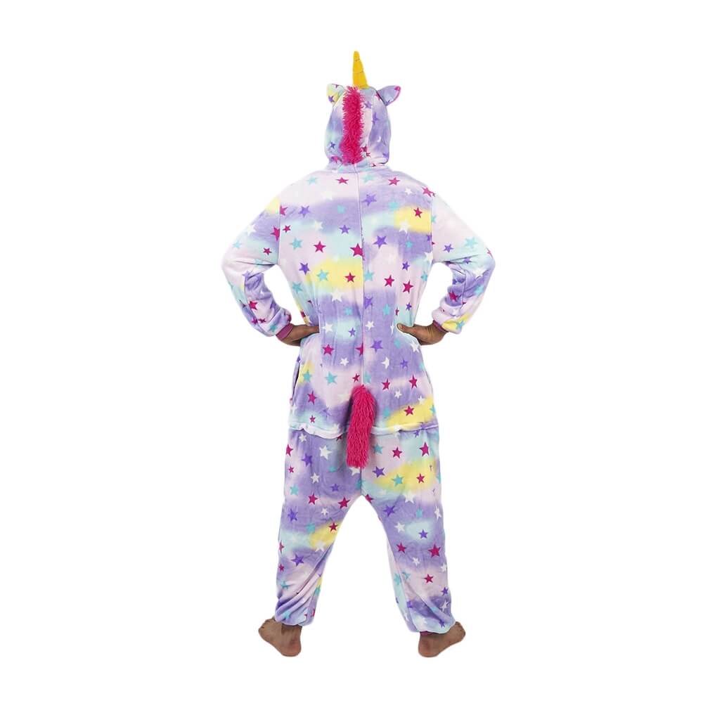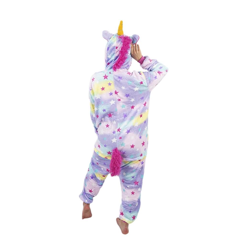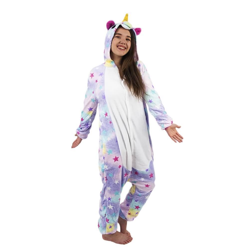 Красочный кигуруми Единорог создаст праздничное настроение. У него фантастический дизайн: большой мягкий рог на капюшоне, розовая грива и объемные ушки, сзади – хвост под цвет гривы. Основная ткань – разноцветная, усыпанная звездами, а на животике – белая вставка.