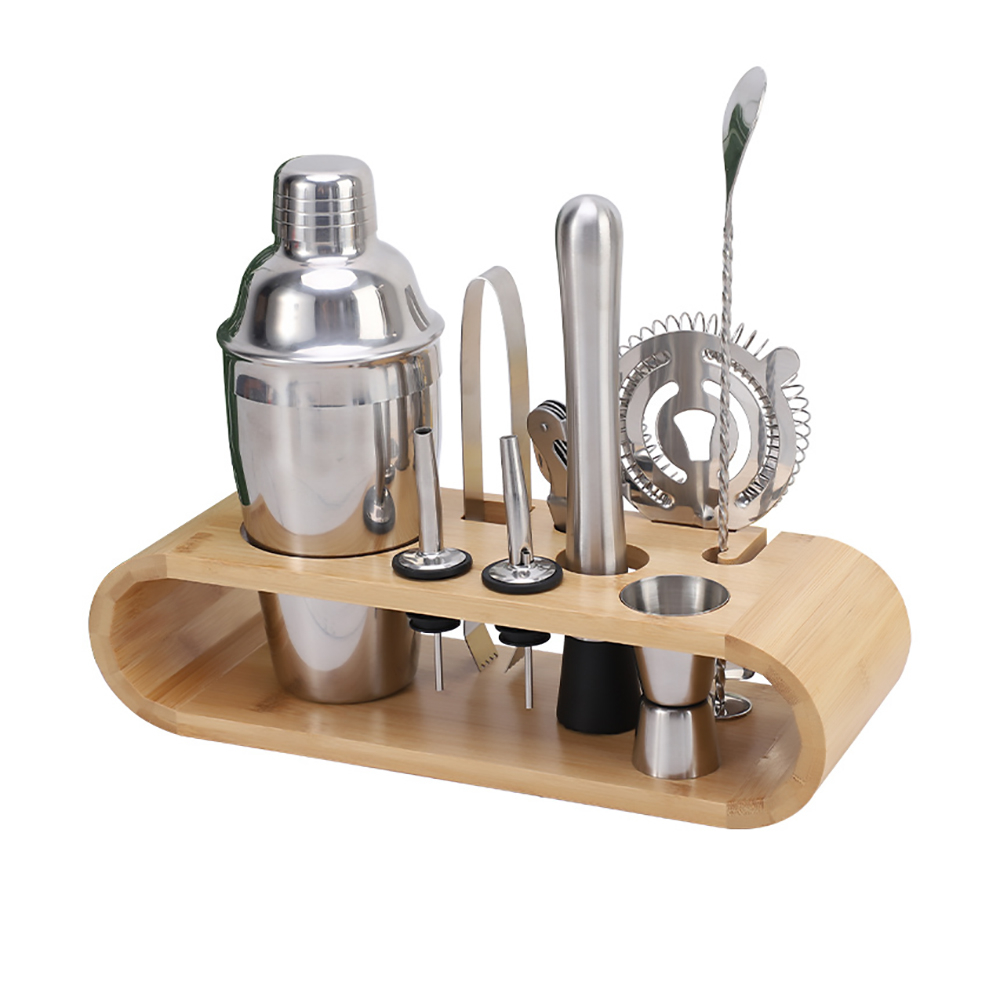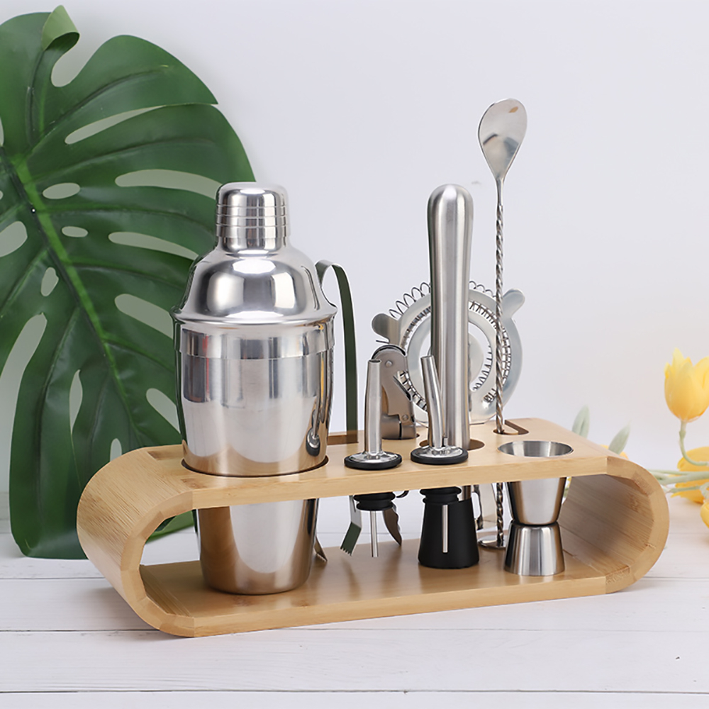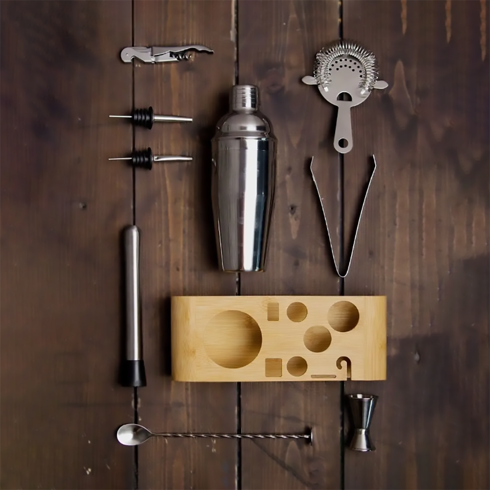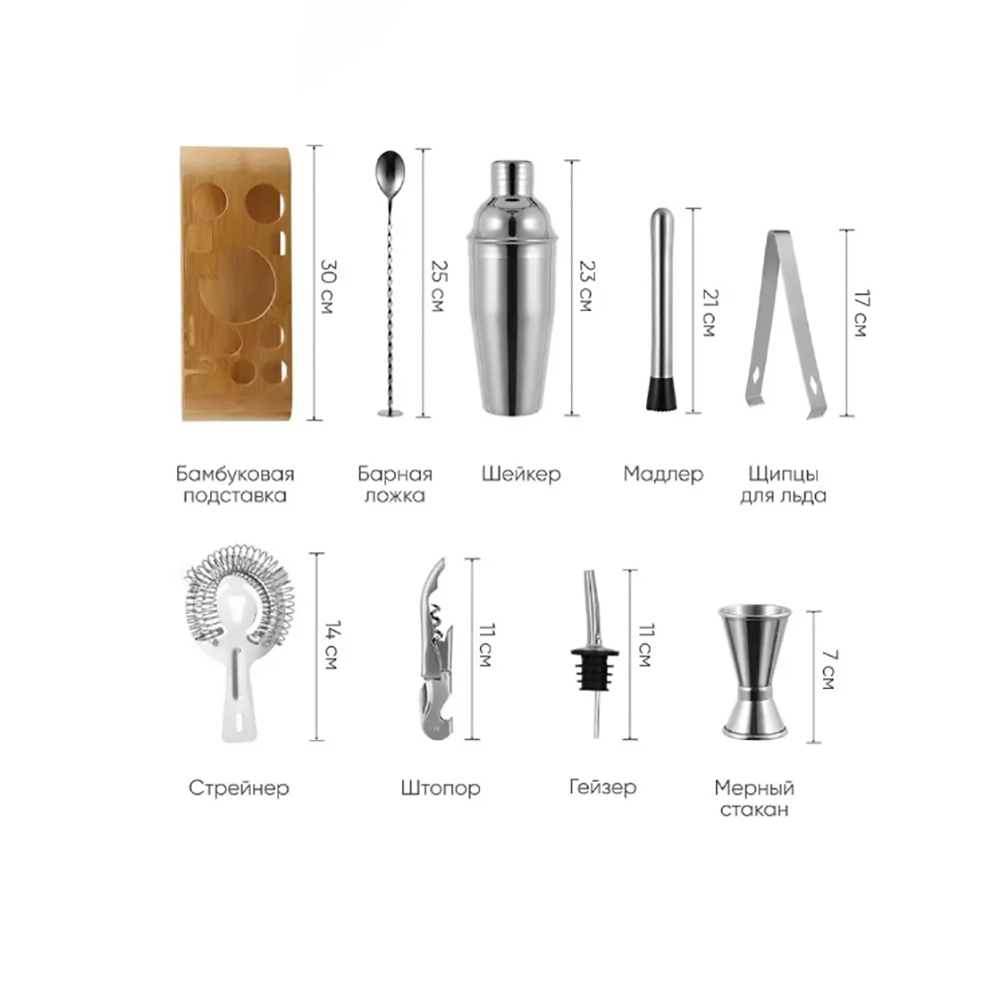 - В набор входитМерный стакан - 1 шт, Бамбуковая подставка, Барная ложка - 1шт, Стрейнер - 1шт, Щипцы для льда 1 шт, Штопор - 1 шт, Гейзер 1 шт, Шейкер барный металлический из нержавеющей стали - 1шт, Мадлер - 1шт, Бамбуковая подставка