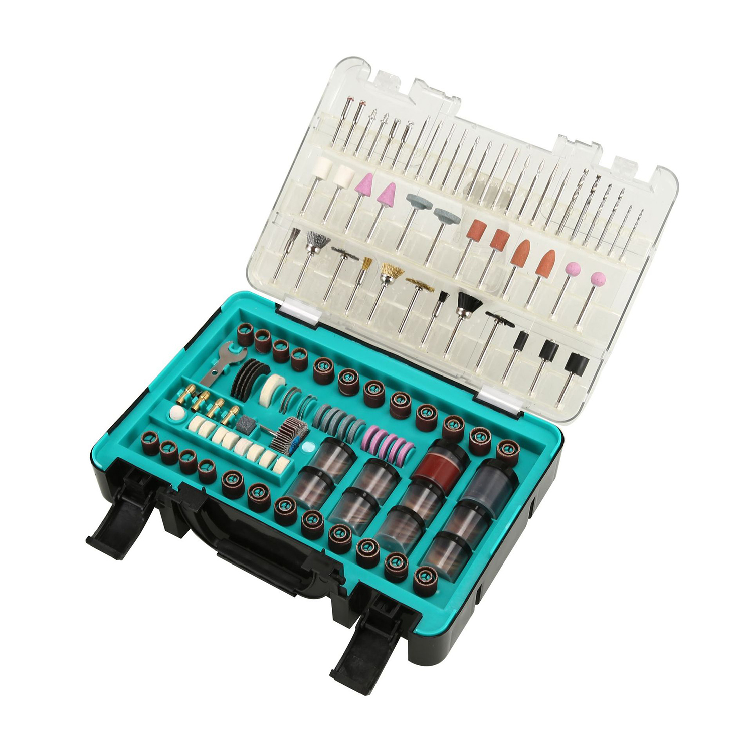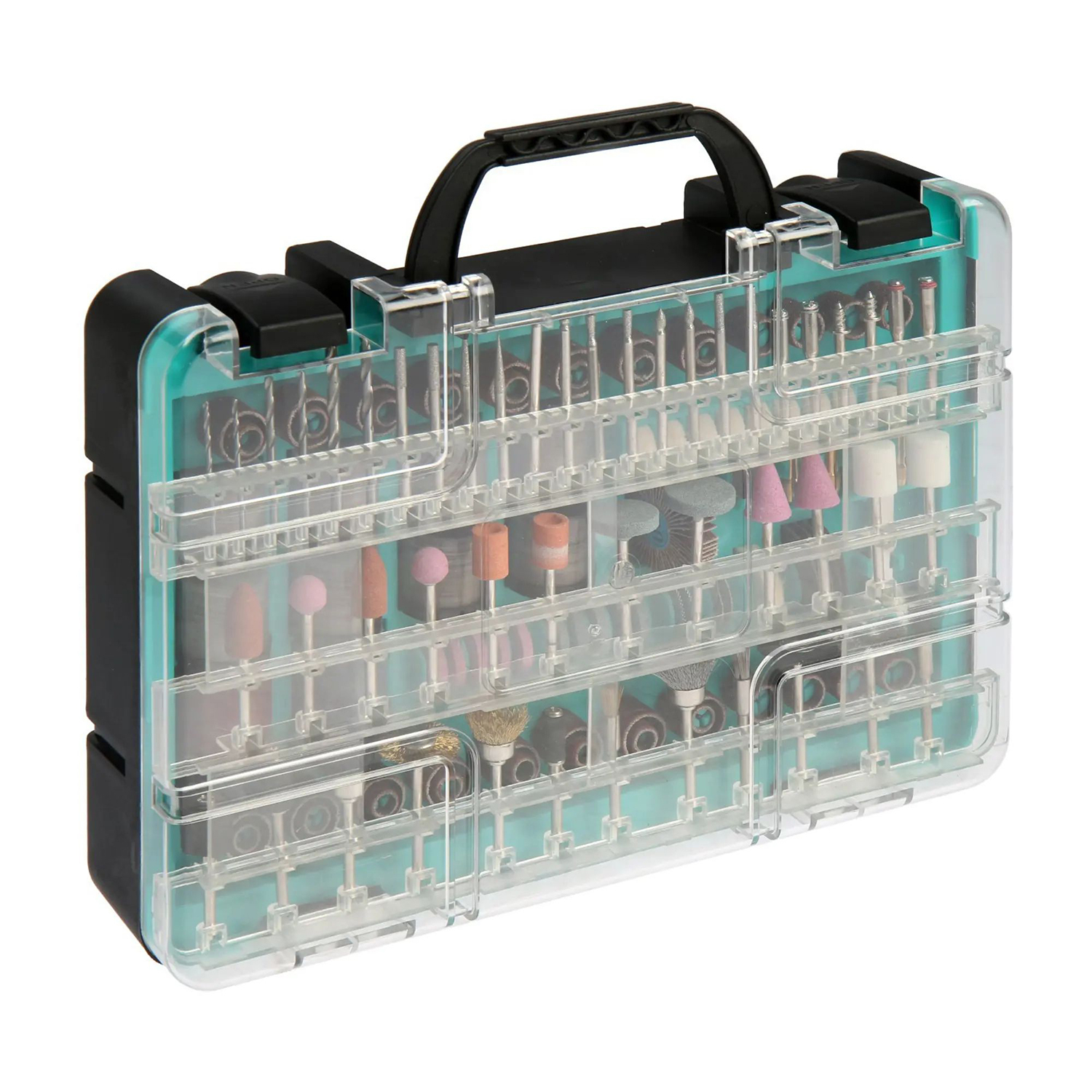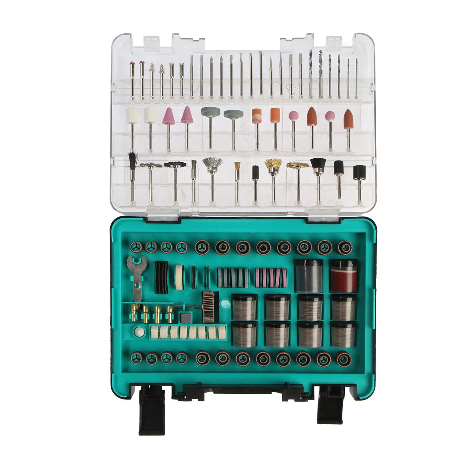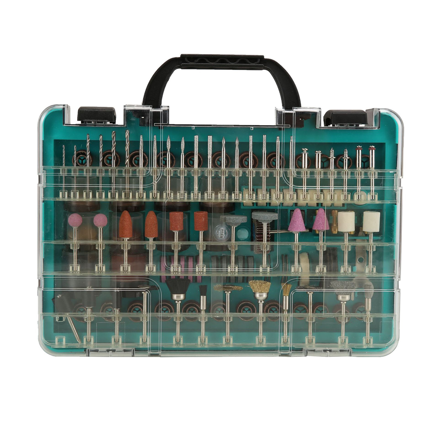 Составляющие набора разнообразны и позволяют решить множество задач: шлифовальные диски различной зернистости, отрезные круги для высоких нагрузок и стекловолокна, шлифовальные круги и ленты, алмазные коронки, щетки из различных материалов, точильные камни и многое другое. Всего в наборе содержится 420 предметов, что делает его идеальным выбором как для профессиональных мастеров, так и для любителей ремесла. Все это компактно упаковано в пластиковый кейс размером 25.9х18х6 см, который легко можно взять с собой в любое место и хранить инструменты организованно и безопасно.