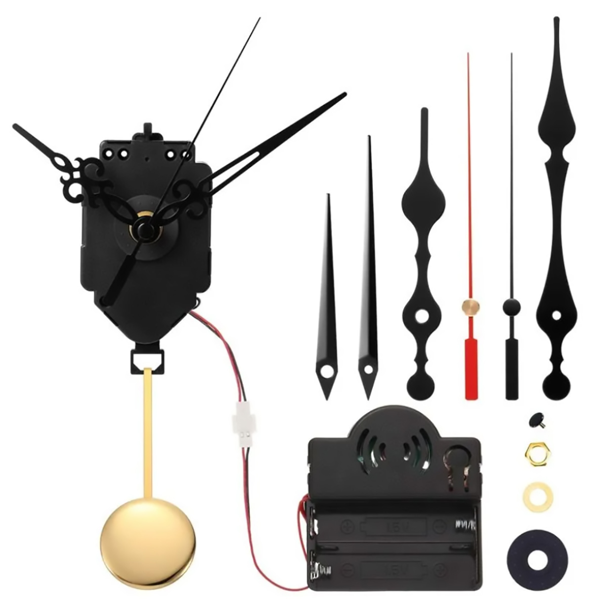 В комплекте с механизмом поставляется качающий механизм для маятника, золотой маятник для элегантного внешнего вида, а также музыкальная шкатулка для приятной атмосферы. Кроме того, вы получаете три комплекта часовых, минутных и секундных стрелок, позволяя вам выбирать наиболее подходящий дизайн для ваших часов.