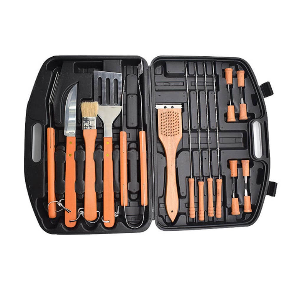 Набор для барбекю и гриля Grillar 18 предметов содержит все необходимые инструменты для комфортного отдыха на природе. Набор инструментов для барбекю поставляется в пластиковом прочном кейсе с надежными замками-защелками. Все инструменты, входящие в набор для гриля и барбекю, изготовлены из пищевой нержавеющей стали, а рукоятки из древесины, окрашенной в красный цвет. Кейс, в который уложен набор для гриля, имеет разделения под каждый инструмент. Набор для барбекю позволяет готовить на огне, мангале, гриле мясо, рыбу, овощи, грибы. Инструменты оснащены удобными веревочками на рукоятке, за которые их можно подвесить для просушивания. Набор для барбекю в кейсе выглядит стильно и презентабельно, поэтому его можно подарить даже профессиональному повару.