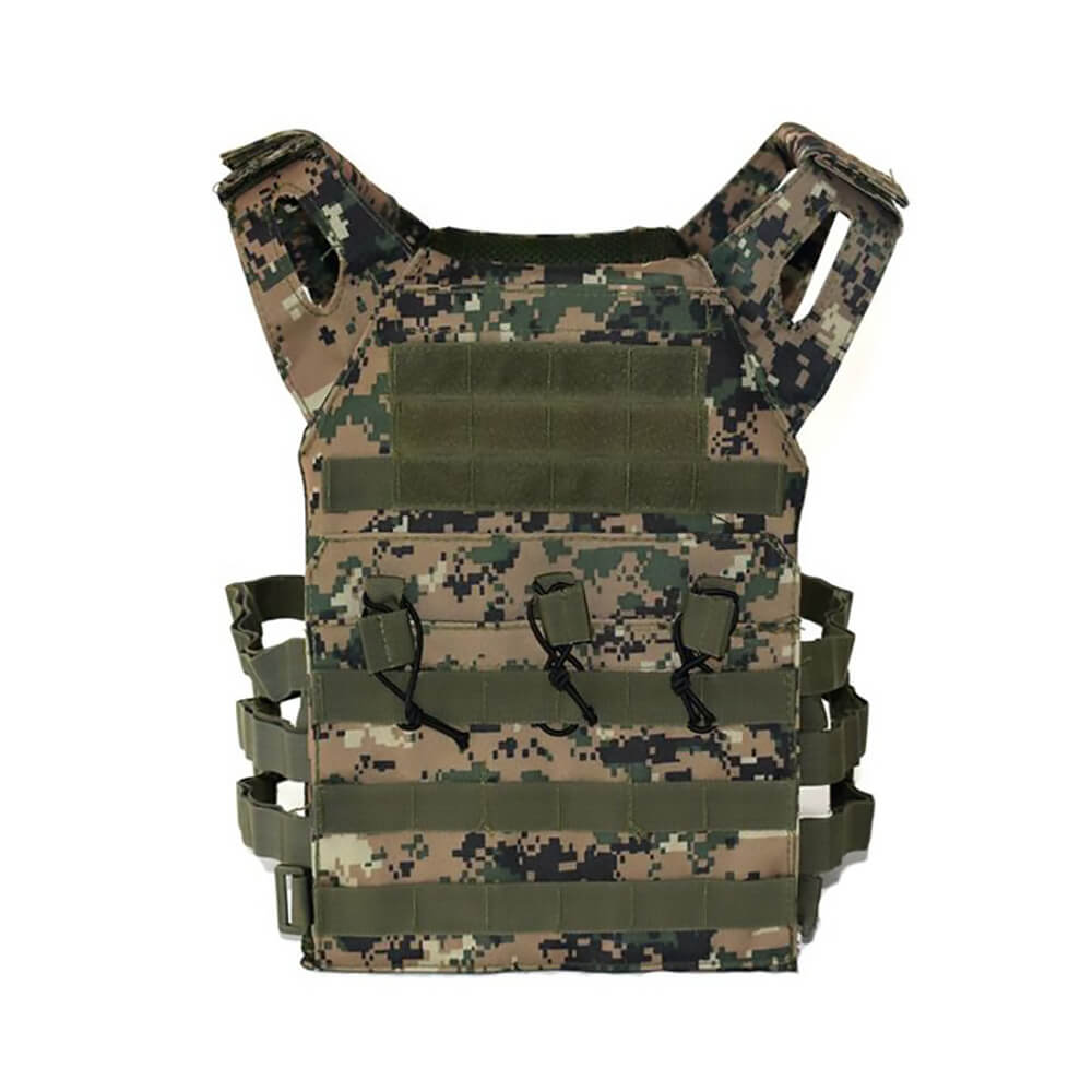 Тактический жилет JPC с двумя ПЭ пластинами Digital jungle армейский используется для защиты человека от пуль, ножевых ранений. Военный жилет изготовлен из прочной ткани Оксфорд, не боится дождя, загрязнений и снега. Размеры бронежилета с пластинами регулируются по фигуре за счет эластичных резинок по всей поверхности. Боевой бронежилет имеет широкие лямки для плеч, благодаря которым нагрузка распределяется равномерно по всему корпусу. Тактический жилет с пластинами выполнен в песочном цвете хаки, за счет чего хорошо сливается с опавшей листвой. Жилет подходит для ношения летом, весной и осенью.